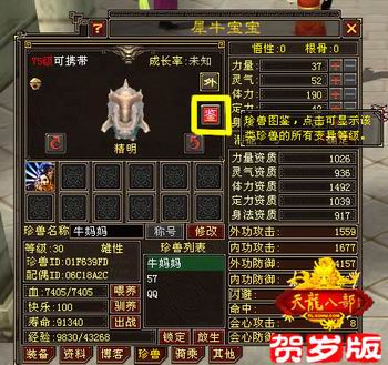 2008《天龙八部》贺岁版特别推出【珍兽图鉴】功能,让每个玩家都成为珍兽专家!看到感兴趣的珍兽,只要点击“珍兽界面”新添加的按钮“鉴”,就能了解珍兽的详细资料,不但珍兽名称,可携带等级,食性,资质偏向,变异等级评定都一目了然,珍兽各个变异等级的形态也360度大曝光。让您更全面的了解到珍兽的各项特点,轻松辨别珍兽强弱,并能早日确定珍兽的培养方法。