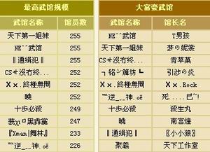 现在就来瞧瞧名门武馆排行:一区电信名门女子武馆:“天下第一姐妹”。馆长:梦の妮裳,二区网通名门武馆:{處侽ヽ&{處钕ヽ﹖馆长:雅雅♀寶貝。三区电信名门武馆:红色娘子军,馆长:温州小妹。以上武馆都位列全区武馆排名前三,并有着服务器255封顶的武馆最高人数哦。(女人撑起了半边天……)