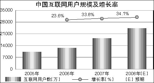 报告透露,2007年中国互联网用户规模增长率达33.8%。即2007年中国互联网用户规模增长率较2006年增长33.8%,预计2008年较2007年增长率将达34.1%。