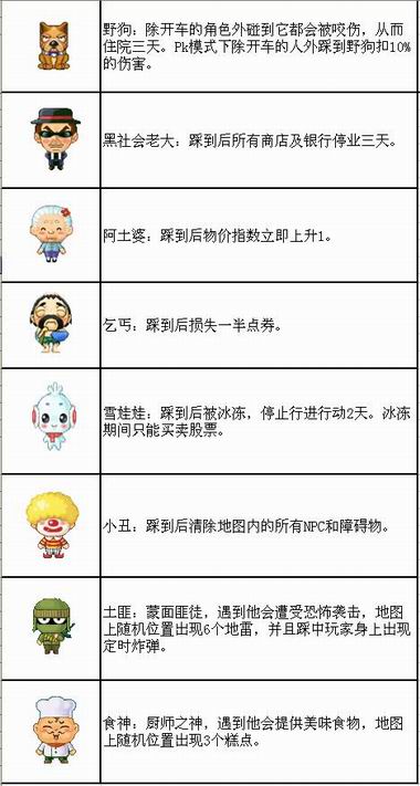 《大富翁(专题 截图)online》(简称“网络大富翁”)里除了我们常用的道具卡片、各路神仙之外,还有很多神秘的特别NPC站在路边等你相会。比如土地公、阿土婆、雪娃娃、乞丐、黑社会老大……三教九流应有尽有,甚至还有让MM们闻之色变的野狗在路边等你。碰巧遇上这些NPC你将会有特别的际遇,比如遇上乞丐后,珍贵的点券会少掉一半,遇上雪娃娃会被冰上三天不能动弹,而路上遇见野狗就会被咬的遍体鳞伤不得不去医院治疗。今天小编就在这里详尽的向大家介绍这些特别的NPC,大家一定要做到完全了解、知己知彼,有句话说得好:小心驶得万年船嘛!