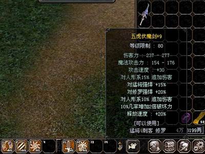 “五虎伏魔剑+9”,等级限制80,伤害力237~277,魔法攻击力154~176,攻击速度+30,对人形系15%追加伤害,对猛将强悍15%,对修罗强悍20%,对人形系10%追加伤害,10%几率增加2倍破坏力,释放速度+20%。从武器DIY的属性看得出来,“蓝魔V眼泪”是一个典型的PK型玩家,他综合自己职业的优劣势打造出这件极品,无论跟其他任何职业PK都占据了统治地位,可谓无往不胜。这件稀世珍品恐怕要令《自由世界》每一个玩家都为之振奋和羡慕,在这里再一次恭喜获奖玩家“蓝魔V眼泪”!