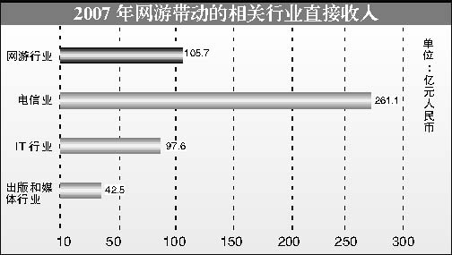 2007年,电信业务受网络游戏带动产生的直接收入达261.1亿元人民币,此收入是网络游戏市场销售收入的2.5倍。IT行业由此产生的直接收入在2007年达97.6亿元人民币,接近中国网络游戏市场实际销售收入,IT产业收入的主要来源是PC、网络游戏服务器、网络及存储产品、软件及服务等。出版和媒体行业由此产生的直接收入在2007年达到42.5亿元人民币,相当于网络游戏市场销售收入的0.4倍,比2006年的39.4亿元人民币增长8%,这部分的收入主要来源是游戏类报纸、杂志、书籍、网络媒体的发行与销售收入;其中出版和媒体广告由此产生直接收入为10亿元人民币。