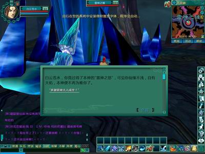 下面便要开始正式渡劫了,大家要做好充分的渡劫准备,特别是要准备一条移动速度很快的宠物,用处下文会说明,准备完毕后再次与天剑对话,启动传送阵传送到天雷锋。