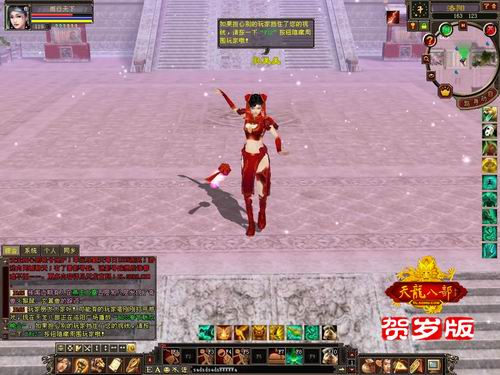 "尊敬的各位领导,各位来宾,亲爱的朋友们,大家晚上好!《天龙八部》首场春节连环晚会马上就要开始了,晚会由我孙美美来为大家主持,在此祝贺各位大侠新春愉快,万事如意!听,春天的脚步正在向我们走来,轻盈的脚步将叩响每一颗心。下面就请大家欣赏舞蹈《欢乐天龙年》,表演者:草原BOSS白冥启......"2月6日21时15分,洛阳城中心的府前广场将现场直播"天龙BOSS春节联欢晚会"!来自各大场景的恐怖BOSS们将会逐一登场,向广大《天龙八部》的玩家拜年!只要留心倾听他们的表演台词,你会发现这其中有很多令人惊喜的小秘密呢。如果遗憾错过了2月6日的首播也不要紧,直至2月12日,每晚相同时间晚会都将在洛阳广场进行重播。