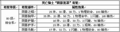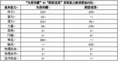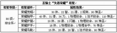 通过以上两张表,再结合下表中套装数值对比分析的报告,我们可以看出,套装“失落荣耀”主要强化“圣骑士”职业在体力与神圣方面的属性,从而使“圣骑士”在游戏中成为当之无愧的“辅助奶爸”与“光明血牛”。而套装“阴影笼罩”则注重强化“死亡骑士”在攻击方面的能力,但是没有智力点数的追加恐怕会令死骑在今后练级用蓝时有些捉襟见肘,并且“阴影笼罩”套装与同等级的“失落荣耀”套装在体力方面的追加效果相差并不多,所以如果让穿着“阴影笼罩”套装的死骑来扛一下BOSS,还是可以的。
