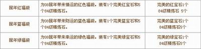 包含红蓝绿三种完美宝石的福袋即将上架!你再也不用为打不到完美宝石,做不了84精装备而犯愁了,购买鼠年福袋,让我们都成为强者!