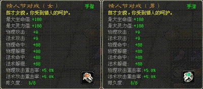 首先推荐的,当然是价值500元宝的情人节对戒包。“钻石恒久远,一颗永流传”,更何况是一对刻有强大法力的7修1橙装属性戒指!银亮的双环设计,一男一女的鲜明标志,还有那一绿一红双色的心心相映,无不显示着这对戒指的优雅魅力!再加上无装备等级限制要求,与戒指本身具备的强大能力,这绝对是一组《大唐风云》世界情人定情的首选礼品!
