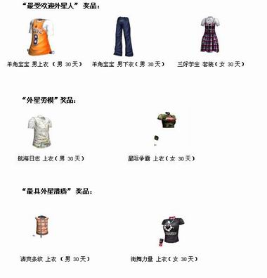 在2月21日至29日之间,赶快登陆《劲舞团》将自己打扮起来,挑战创意和非主流的极限。只要你上传这些游戏或生活内另类奇怪具有非主流的特征图片。图片上需配上一句让人头痛的火星文参与活动。活动将根据玩家投票评选出5大“最受欢迎外星人” 奖;官方将评选出“外星劳模”奖(上传作品最多)、“最具外星潜质” 奖(文字最难看懂)各1名。