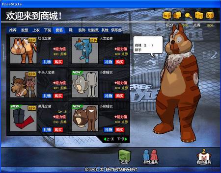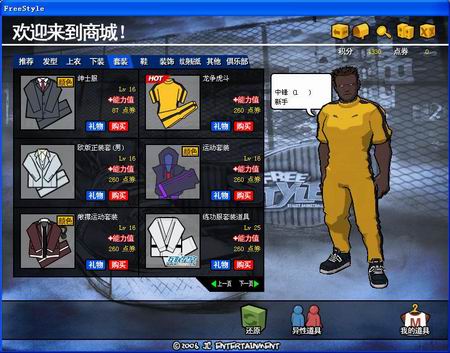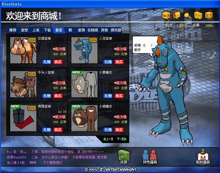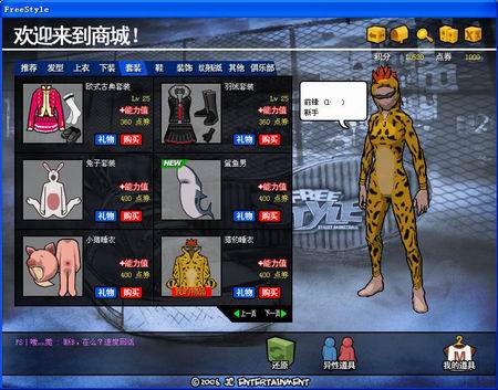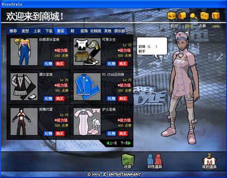 这些服装,以动物造型为主,可爱的的松鼠套装,性感的豹纹套装,怪异的兔子套装等,让想独一无二的玩家有着更多的选择,而勾人的护士装,可爱的吊带工装,充满阳刚气的龙虎套装,则又让玩家能选上自己最喜欢最合适的。而穿上这样的服装,还加不少的能力值,让你跳得更高更远,扣得更准更快。
