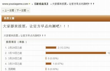 近期在《英雄之门》官方论坛游戏意见版区中出现了一个热门的投票帖,投票的内容主要是以《英雄之门》内测时间为主,玩家自发组织这个投票想让官方加强关注度。从目前的投票结果来看,90%的玩家希望官方在3月10日前开启内测,并有玩家在帖子下写出“我爱《英雄之门》抵制跳票!”等类似的慷慨言辞。(图2)