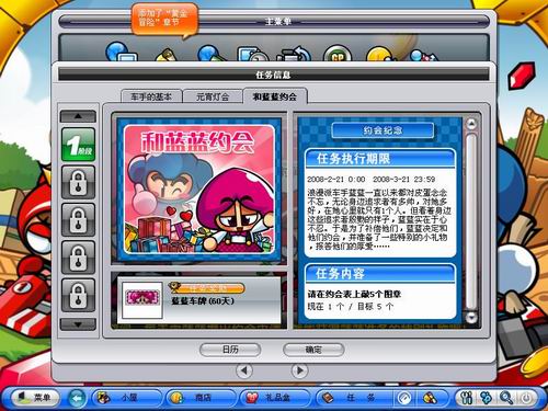 喜欢赛场中风驰电掣的刺激,当然要登陆《跑跑卡丁车》,不过2月21日至3月21日期间最好不要错过其中的任何一天哦!因为这段时间,每一位车手都能和浪漫派美女车手蓝蓝约会,如果能够挑动她的心弦,还能够获得令你惊喜不已的豪华爱心大礼!