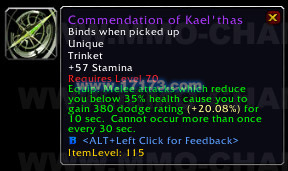 装备:将你的生命值降低至35%以下的近战攻击将增加你的躲闪等级380,持续10秒。30内只能触发一次