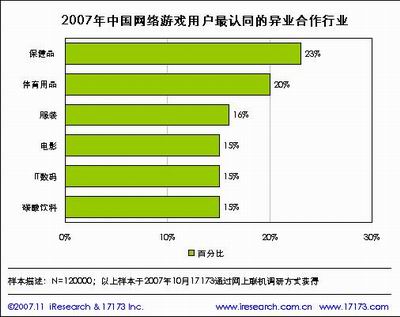 近年来,包括快消品、汽车、服装、IT甚至于旅游业的不少知名品牌都向规模大、参与人数多、有良好口碑的网络游戏伸出了橄榄枝,在网吧渠道、活动赞助、用户互动等方面,与网络游戏进行了全面而又深入的合作。根据17173及艾瑞咨询联合发布的《17173第7届中国网络游戏市场调查报告》数据显示:2007年有78%的网游用户对游戏与其他行业的异业合作持支持态度,而“保健品”而成为最受玩家青睐的合作对象。