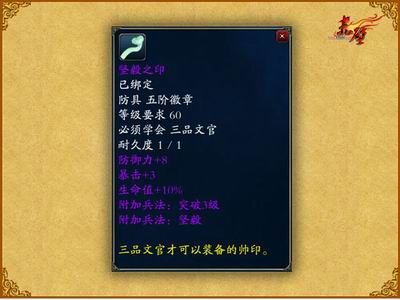由于武官以及文官的不同,玩家所拥有的官阶称号也有所不同,“三品平东将军、三品中书令、三品太子少傅”等称号,令玩家在拥有了梦想的官阶称号之后还同样别具个性。当拥有了更高的官阶官位时,玩家同时也将获得独特的属性附加,而想佩戴官印的话,拥有官阶称号是首要条件哦。