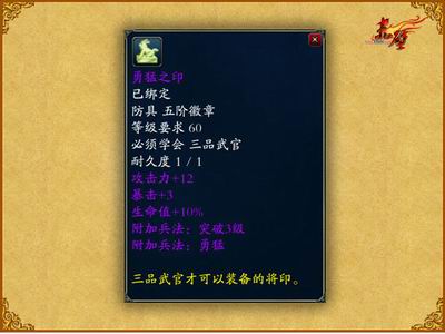 勇猛之印、统御之印、辅佐之印、主宰之印……种类繁多的官印,不仅象征着一种权威,更为玩家带来了强悍的附加效果。由于官印对官阶条件也有一定限制,因此高阶的官位所拥有的官印将更附卓越属性,而同时还将拥有高阶官位独有的全新强悍技能——附加兵法。相信在未来国战之中,拥有高阶官职的玩家将称霸战场,独占鳌头!