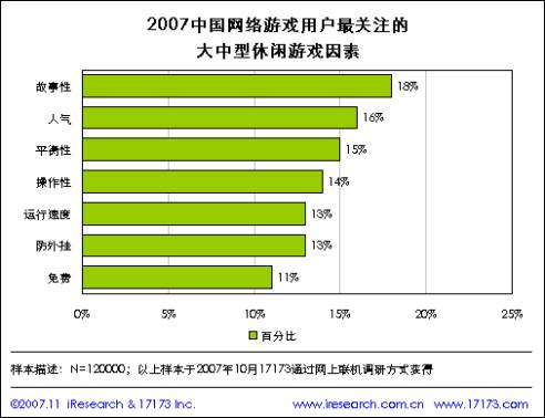 从调查中我们可以看到,网游玩家最重视的游戏要素就是故事性。拿广受玩家欢迎的《魔兽世界》来说,能够拥有如此多的用户,秘诀并非只在精美的画面和优秀的游戏设计,一个主要原因是游戏中深厚的文化底蕴以及精彩的故事背景。美国暴雪的《魔兽争霸》系列游戏是一部史诗式的故事,通过游戏扩充剧情,让玩家在长期的游戏过程中逐渐接受和熟悉《魔兽》的故事。于是《魔兽世界》一经推出,就受到了全世界包括中国在内所有喜爱《魔兽争霸》背景故事的玩家追捧。