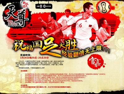 虽然在上半场比赛中国足暂时与对手战平,但《天尊Online》的玩家却对国足充满信心,更是在游戏中、论坛上、QQ群里热切关注着这场比赛。不仅仅因为这场比赛对中国男足的世界杯之旅意义重大,更因为根据比赛结果的不同,玩家将可能享受到《天尊Online》送出的超级经验回报。