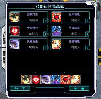 游戏技能:三个职业都有基本技能芯片(狂暴打击、风暴涉及、致命狙击)三个1级芯片,在角色创建后即获得,无需购买。其他战斗技能芯片通过NPC购买获得。主动及被动技能芯片购买时需角色达到该技能芯片购买条件才能购买。关联被动技能必须在所关联的主动技能已购买的前提下,才可按照对应的级别进行购买;【升级技能】 每当您的角色升级,尽量到NPC处去看看是否有可以购买的技能芯片 ;【技能的使用】 所有的技能芯片必须装备后方可在战斗中使用。在战斗开始前,选择装配所需求的技能芯片后进入战斗后既可使用对应的战斗技能。