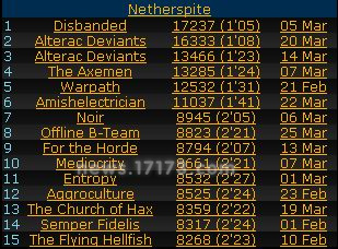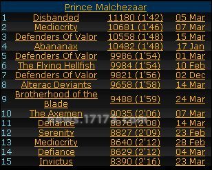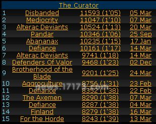 编注:列表分为3列,第一列是击杀公会,第二列中靠左数字为他们的团队DPS,靠右为击杀时间,第三列为击杀日期。对于那些3个标准的DPS测试BOSS:风暴要塞-空灵机甲,黑暗神庙-泰隆·血魔,太阳之井高地-布鲁塔卢斯,给出了最快击杀的团队配制,希望对广大玩家有所帮助。
