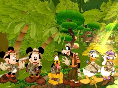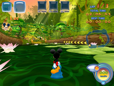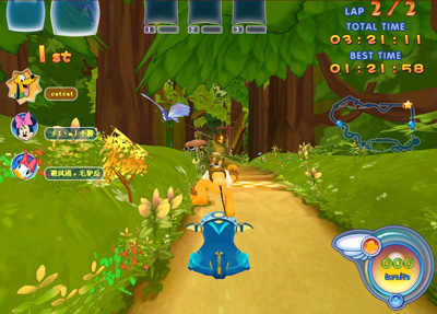 《迪士尼魔幻飞板(专题 截图)》的森林赛道是整个游戏中最为隐秘、幽深的地方,是玩家想象中原始、奇异、纷繁复杂的神秘世界。锯齿般灰白色陡峭的山锋映衬着碧绿浓密的树林,在崎岖蜿蜒的赛道上、在那连绵的雄伟山林之中,点缀着一个绝美而原始的迪士尼乐园。那些用坚实石块或木板彻成的路完全没有奢华与复杂,带着一种奇特而迷人的古朴与厚重感,沁人心脾。