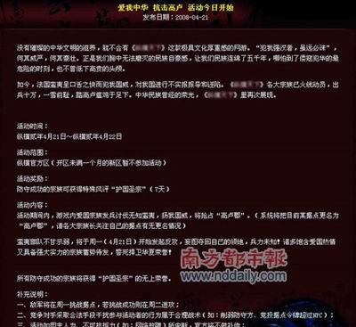 21日,各大游戏网站都出现一篇新闻通稿,称盛大旗下一款针对白领、学生、无聊宅男的网页型网游推出“抗击高卢护我中华”活动.