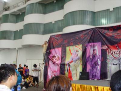 在下午开始的第一个节目是重庆“毒”漫画社表演的“蔷薇少女——徊旋之舞”, 他们道具是个巨型喷绘,社团里女选手居多,搭建起来非常困难,这时现场同时出现了7,8位工作人员,还迅速借来了2个脚手架,忙了足足有30多分钟才帮忙把道具喷绘竖起来,现场观众对于选手的敬业和工作人员的热心报以了热烈的掌声。