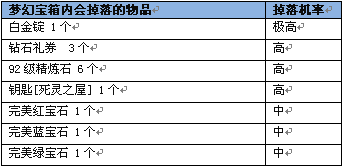 2、 每次双击梦幻宝箱,将掉落以上表格所列物品中的一种。