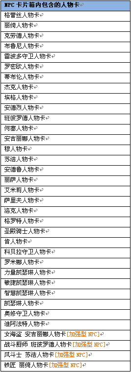2、 每次双击NPC卡片箱,将掉落以上表格所列人物卡一张。