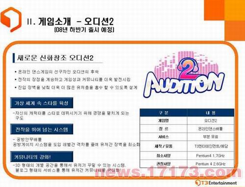 5月21日,在韩国举行的《Audition》(劲舞团)开发商韩国T3娱乐收购韩光软件相关记者座谈会,公开了大量T3的新网络游戏。