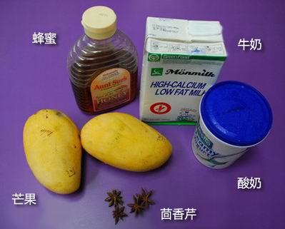 材料:* 成熟的芒果* 牛奶* 原味酸奶* 蜂蜜* 星形茴芹或者茴芹种子* 一个搅拌机
