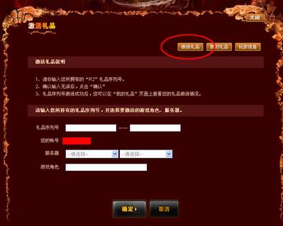 四、进入“激活礼品”页面,输入您获得的礼品序列号,服务器名称,以及您的游戏角色。点击右上角的“激活礼品”您就可以成功激活您获得的《R2》“礼品卡”了。