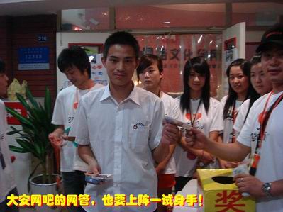 比赛报名期间,我们迎来了三位“义务推广员”——三个可爱的七、八岁的小娃娃,蹦蹦跳跳,要求和哥哥姐姐们“做推广游戏”…想不到他们竟在活动网吧门口邀请到十几个路过的大学生来参加比赛… 更让人哭笑不得的是他们竟然还把一个保洁阿姨推进现场,告诉工作人员:“她要玩《弹头奇兵》…”