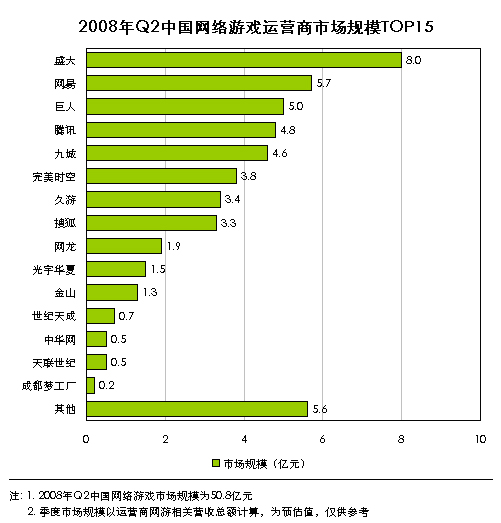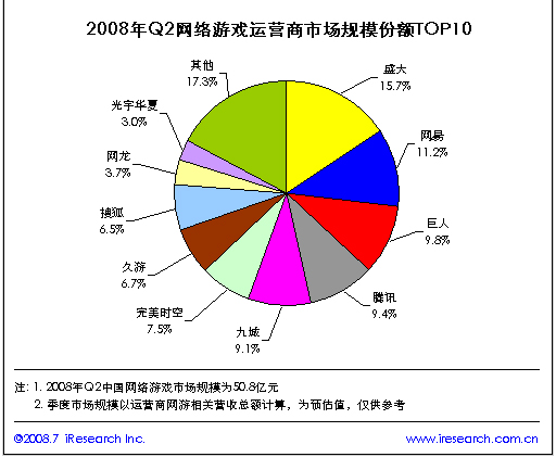 7月11日,据艾瑞咨询最新发布的《2008年第二季度中国网络游戏市场监测报告》研究显示,2008年Q2中国网络游戏市场规模首次超过50亿元,达到50.8亿元。在运营商收入排名方面,盛大、网易、巨人排名前三甲,腾讯首次超过九城排名第四。