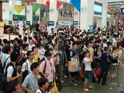 国内国外各大游戏公司、专业表演团体以及各路明星纷纷登场,现场可说是人山人海,每个展台下都有不少观众肩背手提各家周边和资料,举着相机拍Showgirl.然而当来到位于2号馆W2-28展位的悠游网展台之时,才真正地领略到了什么叫做人头攒动摩肩接踵,将展台四周围得水泄不通,人人仿佛都化身成为摄影记者,对着台上的焦点不停地按下快门,是大片发布?是港台明星?是泳装美女?还是杂技表演?