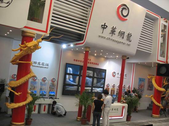 展区以亮白色为基底,象征「网龙」与「游龙」的两条金龙盘踞在正面喜庆正红双柱上,磅礡气势更显现中华网龙与游龙在线多年来专注于在线游戏开发首屈一指的龙头地位。中华网龙相信,研发在线游戏不仅只是信息科技的一环,更是娱乐产业的延伸,通过在线游戏互动与网络无远弗届的传递,网龙将秉持着以科技传承中华文化的精神,勇往直前,立足全球。