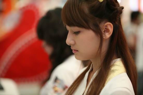 完美时空此次展台上的一位白衣服MM气质脱俗,白衣飘飘如芙蓉出水,在四处露肉的showgirl中鹤立鸡群,令人眼前一亮。