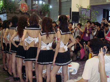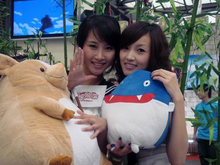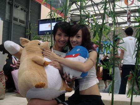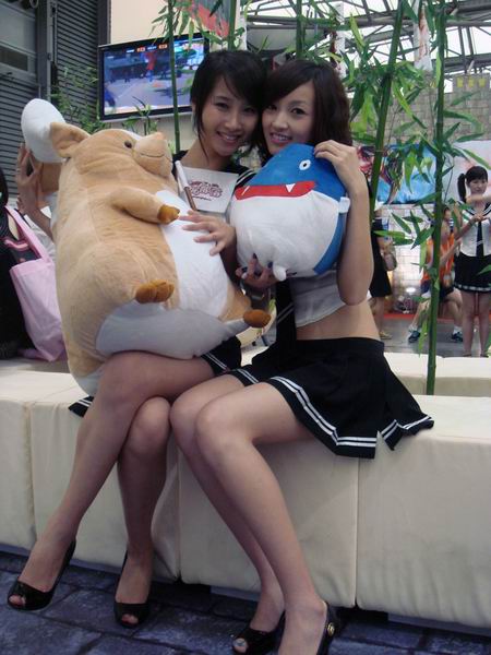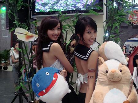 此次2008的chinajoy天游showgirl都身着性感全露背水手服和高叉迷你短裙,怀抱着天游《拍拍部落》的一米高大玩偶皮卡洛,这些都是活动送给玩家得奖品,观众们都纷纷排队等候参加比赛,有些男玩家看到美丽的showgirl竟然借机上去看奖品而与showgirl亲密接触,饱餐秀色,与美女合影。showgirl也十分配合,摆出各种POSS让大家拍个够。