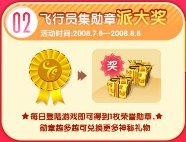 从2008年7月8日到2008年8月8日,只要登陆《QQ飞行岛》,就可以在第二天获得一枚《QQ飞行岛》专属飞行者勋章,这可是献给为村庄做贡献的勇士的,是不是很简单呢!那还不快动身!