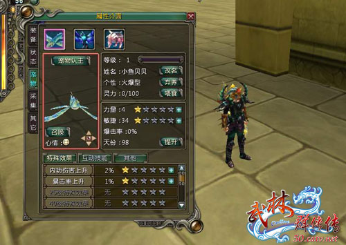 玩家在为自己挑选宠物作为自己战斗的得力助手时,非常注重宠物力量、敏捷这两个属性的初始数值和天分值。数值越大,说明该宠物的成长性越强,将来能具备超高的攻击力和闪避值,是主人战斗中的好伙伴。相对于《武林群侠传OL》其它大多数战宠来说,福宠的初始属性要高得多,可塑性非常强。而且每个福宠一出生就具备了两大特殊效果,这也大大优于其它宠物。《武林群侠传OL》福宠不仅拥有得天独厚的动人外形,同样得天独厚的先天属性,让它们在游戏中备受欢迎和宠爱。