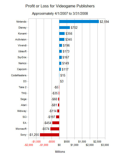 上面大家看到的,是Edge按照综合收入情况统计出的2007-2008年度全球游戏发行商前20名排行榜,顺序就和大家所期待的一样,毫无悬念可言。下一页同样是一份排行榜,只不过是按照盈利和亏损状况统计而出,但结果,恐怕令你难以想象……