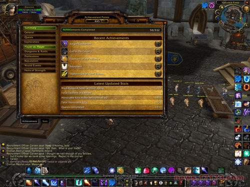 5.个人成就系统,好象和在网上看到的图不太一样,得到成就的办法有许多,甚至包括开地图,当然杀死敌对阵营,PVP都有,but……没觉得给什么好东西……起码现在没看到特别的东西,工会徽章类我是鼠标都不要移上去的