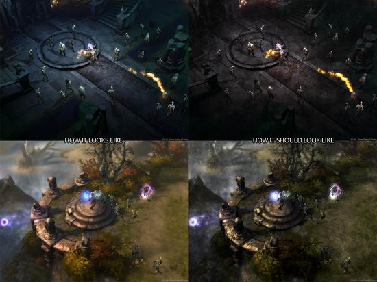 我们不禁会问,为何《Diablo II》玩起来乐趣盎然?于是某些北方暴雪的家伙告诉我们说,“我们并不是把所有地域都弄得晦暗难辨,即便是在这种地区,我们也会特意把怪物弄得五彩斑斓,比如在那些阴暗黢黑的地下城里,怪物被设计得通体透亮,好让它们从背景中跃然而出。”