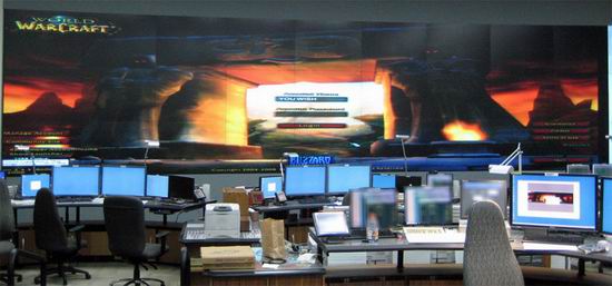 Kotaku的一位网友发来了一张他(或她)在游戏时使用的显示设备的照片,这是一座长40英尺高15英尺(相当于12米x4.5米),由27台67英寸高清液晶显示器组成的巨大屏幕。这位网友在上面玩了《魔兽世界(专区 视频)》和《生化奇兵》等几款游戏,我想他当时感觉应该不错。