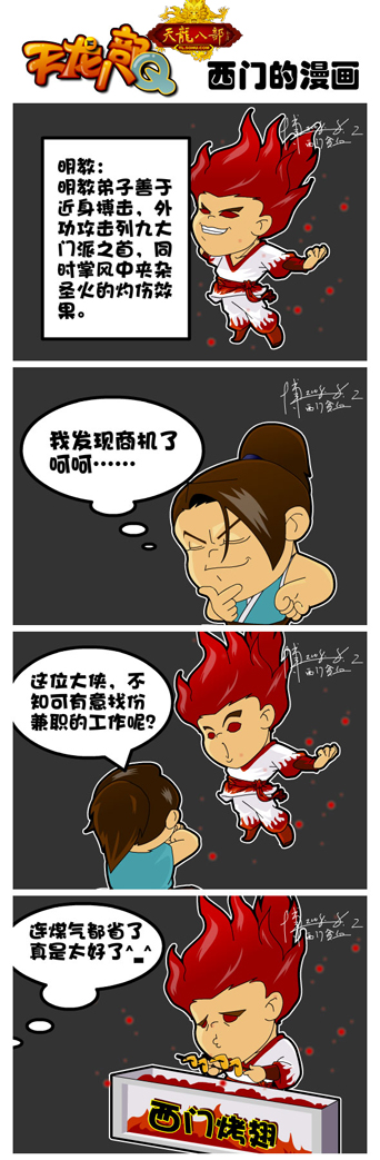 "西门大侠"的漫画实在让人喜爱,称其为"漫画大侠"也一点都不为过。据西门本人透露,他是华北网通一区的玩家,平时十分爱好自创游戏漫画,游戏里的昵称叫☆西门☆,如果有机会见到本人,也可以在玩游戏的过程中和他切磋几招哦!