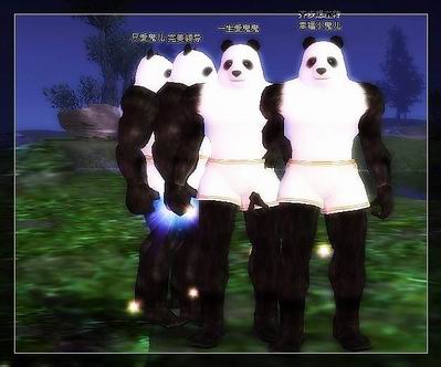 四个熊猫的表演着实精彩,谁能不为之感动?他们四个只是为了博得同伴的女孩笑,如此卖力的表演,让那女孩不开心的小情绪烟消云散。完美大陆上很多玩家都喜欢凑在一起变换形象搞怪,使得大家的游戏生活丰富多彩,你想不想成为他们中的一员呢?快来加入吧!
