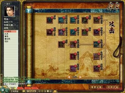 人物的技能按照兵种来分类:步兵、骑兵、弓兵有攻击和防御专精技能,但侧重能力上的不同;轻装兵有攻击和敏捷专精技能;谋士有风、水、火和部队能力专精技能;药师有补给和防御专精技能;炮兵则是营造和部队能力专精技能;道士是精神、雷、毒三个专精技能。武将每次升级可以得到20点专精点数,可到兵营找训练官进行专精训练,武将方向需要自己决定。专精点数可投注在防御或攻击技能上,有些技能的属性会互相排斥,加技能点时需要注意。并且受地形、气候的影响,技能的合理施放都需要考虑。 技能的学习上是采用技能树的学习方式,有些技能需要等级限制、有些则不需要,但是分配专精点还是重中之重。