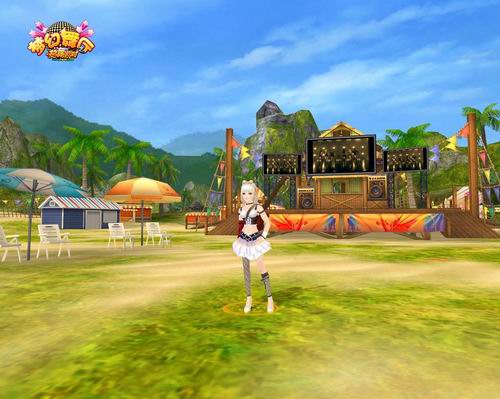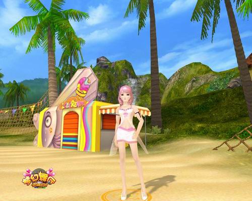 “阳光沙滩”舞厅的正中搭起一个木板舞台,闪动的大屏幕和酷感的音响为这片宁静的海滩增添了时尚和动感。舞台的前方有一座小木亭直伸大海中,玩家可以沿着木质的海边栈道走到亭子中欣赏眼前广阔的大海,远处一艘海盗船搁浅在海边,让我们遐想着海盗船的主人是谁呢?在这艘船上曾经发生过怎样的传奇故事呢?