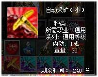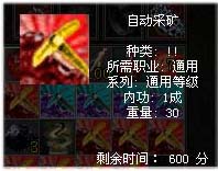 “自动采矿”道具按照使用时间分为240分钟和600分钟两种,自9月3日服务器维护后便可在道具商城中购买。使用方法也十分便捷,只要你完成2转任务学会采矿技能后,将采矿技能放入技能栏,就可右键点击道具开始自动采矿,想要停止只需再次右击道具就可以了。