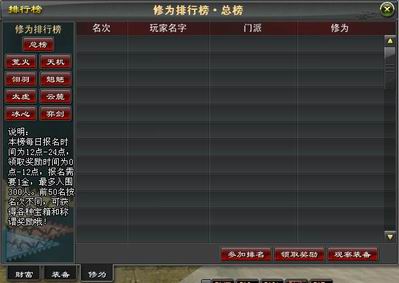 目前推出的排行榜共分为财富排行榜、装备评价榜和修为排行榜三种类型。每个榜上有名之人均是大荒精英中的精英,一起来参加吧。