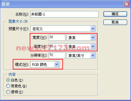 注意:新建文件的各类属性,大小为32*32,类型为RGB图象。